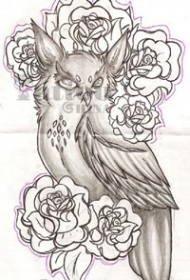 花丛中的猫头鹰手稿纹身图案